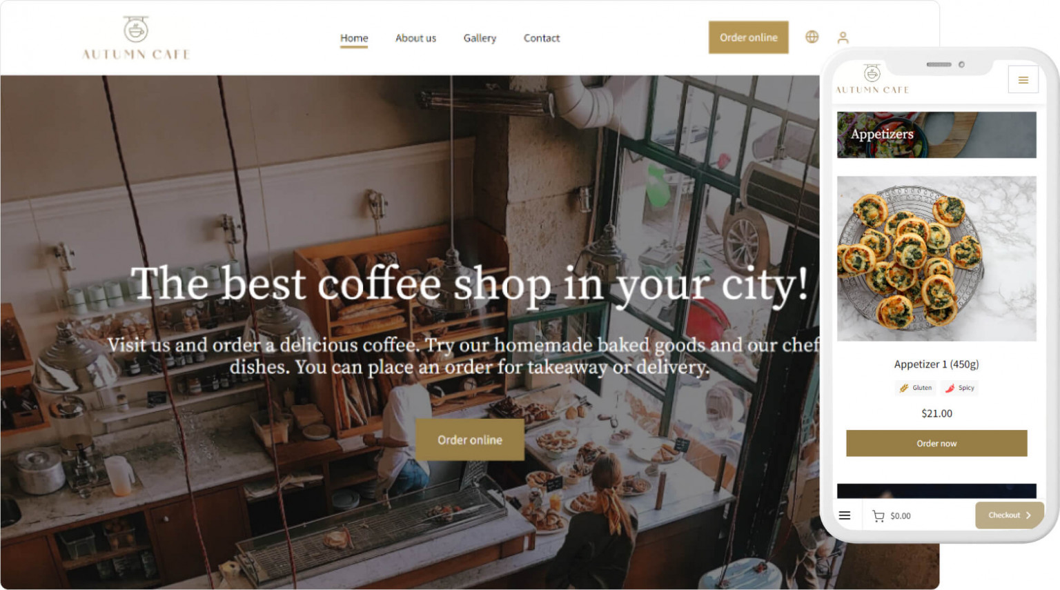 Take your restaurant online with our no-code drag-and-drop editor and get more clients through your doors. Showcase your menu and photo gallery, and start taking online orders through your customized restaurant website.
